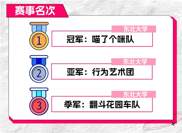 经过多轮对决,【喵了个咪队】成功拿下冠军,喜提1000元大奖!他们在赛场上的精准操作与默契配合令对手与观众都为之折服!【行为艺术团】和【翻斗花园车队】同样表现出色,分别斩获亚军和季军,收获了800元和500元的奖励!冠亚两支战队将携手出征辽宁赛区省决赛,冲击更高荣誉!